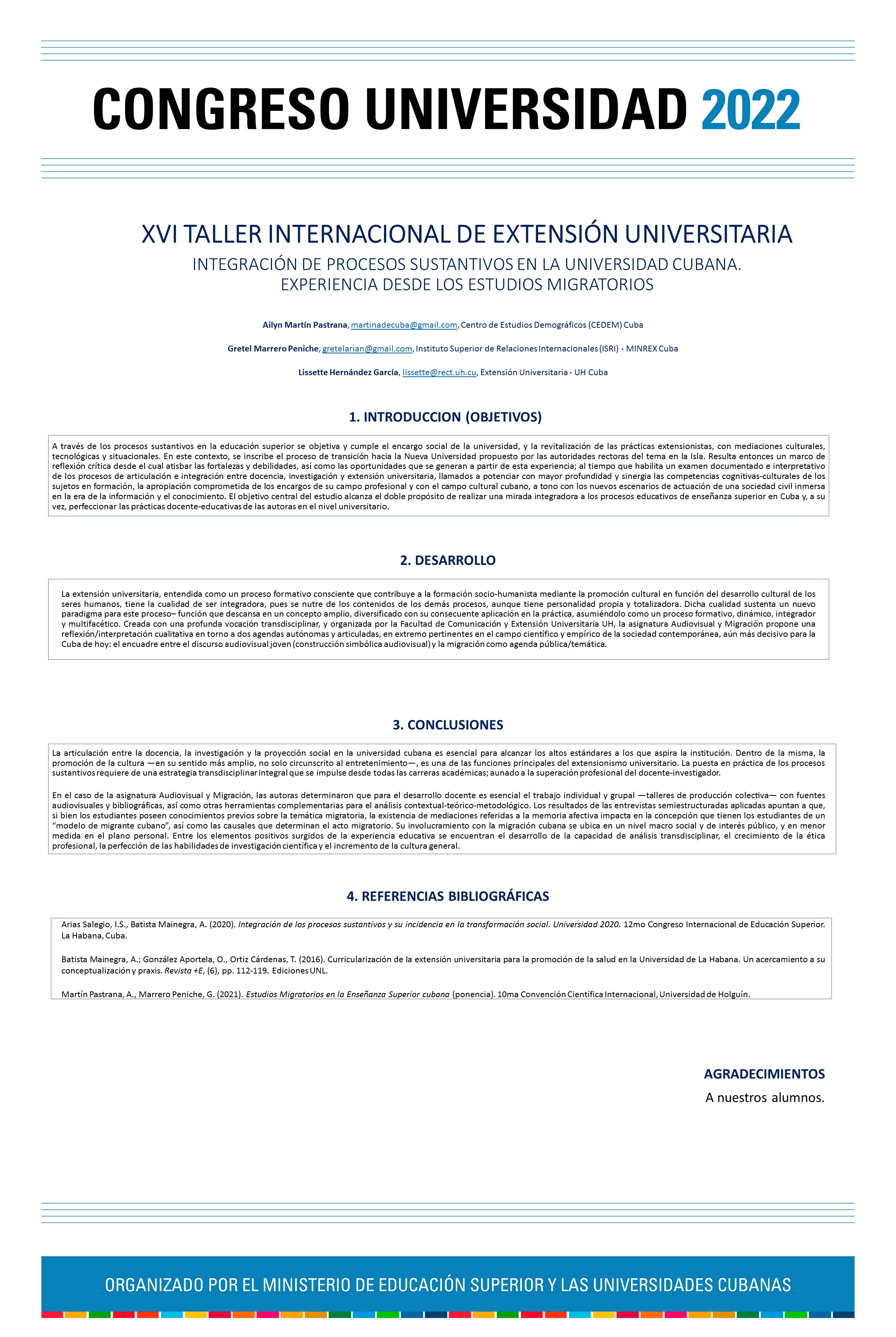El presente artículo se enfoca en la integración de los procesos sustantivos en la educación superior en Cuba. Es a través de ellos que se objetiva y cumple el encargo social de la universidad, y la revitalización de las prácticas extensionistas, con mediaciones culturales, tecnológicas y situacionales. En este contexto, se inscribe el proceso de transición hacia la Nueva Universidad propuesto por las autoridades rectoras del tema en la Isla. Resulta entonces un marco de reflexión crítica desde el cual atisbar las fortalezas y debilidades, así como las oportunidades que se generan a partir de esta experiencia; al tiempo que habilita un examen documentado e interpretativo de los procesos de articulación e integración entre docencia, investigación y extensión universitaria, llamados a potenciar con mayor profundidad y sinergia las competencias cognitivas-culturales de los sujetos en formación, la apropiación comprometida de los encargos de su campo profesional y con el campo cultural cubano, a tono con los nuevos escenarios de actuación de una sociedad civil inmersa en la era de la información y el conocimiento. El objetivo central del estudio alcanza el doble propósito de realizar una mirada integradora a los procesos educativos de enseñanza superior en Cuba y, a su vez, perfeccionar las prácticas docente-educativas de las autoras en el nivel universitario.